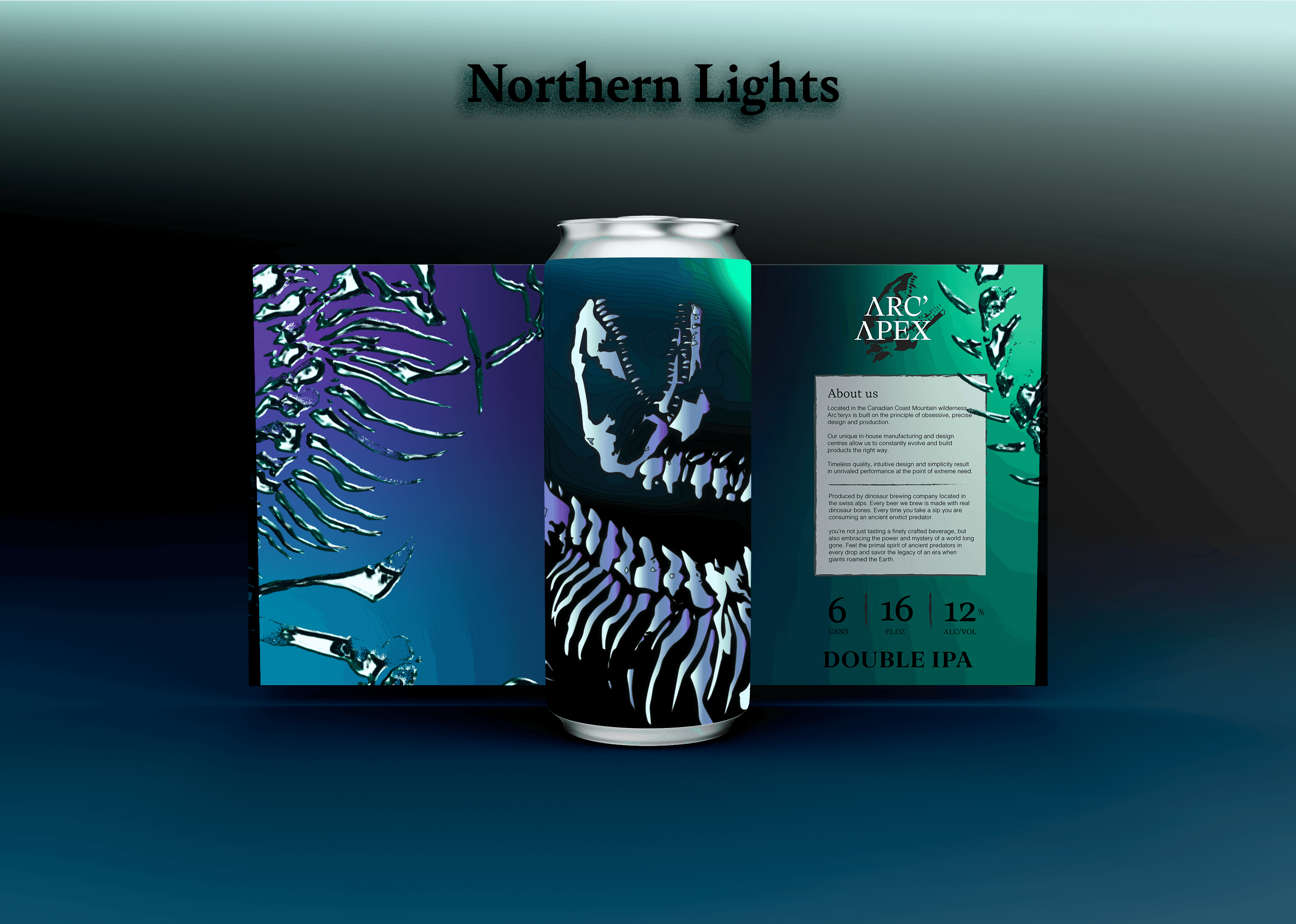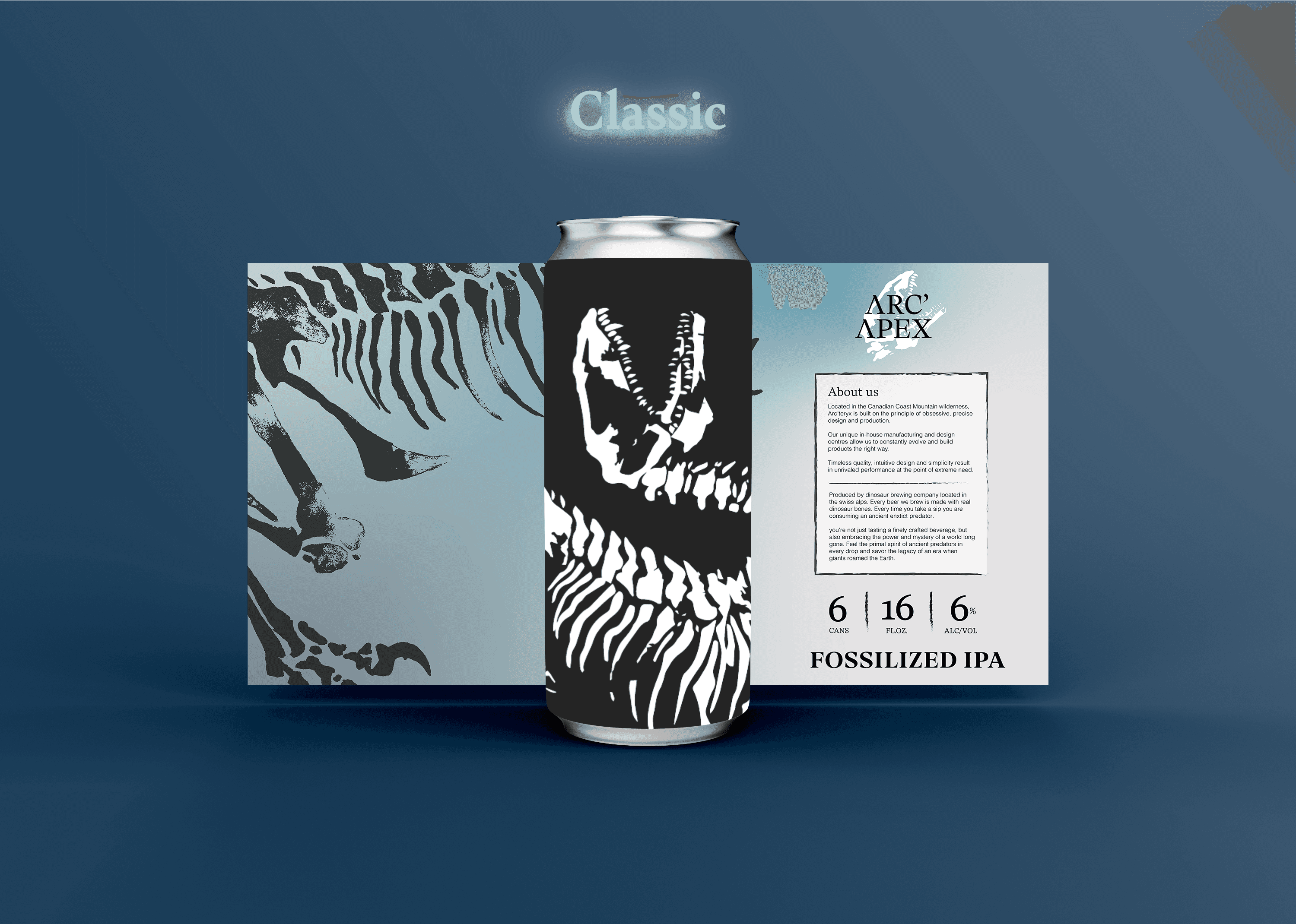 This project focused on redesigning an existing brand realistically to sell a new product within the same target audience. I chose to reinvent the outdoor wear brand Arc’teryx to imagine what it would look like if they released a line of beer. “Arc Apex” uses the marketing techniques and minimal design of the original brand but adapts them to a beverage based format. Using “Apex” to both reference the peak of a mountain and the apex predator that is used on the can designs. Using multiple forms of media, such as package design, product design, video and poster design I worked to bring this new brand identity to life.